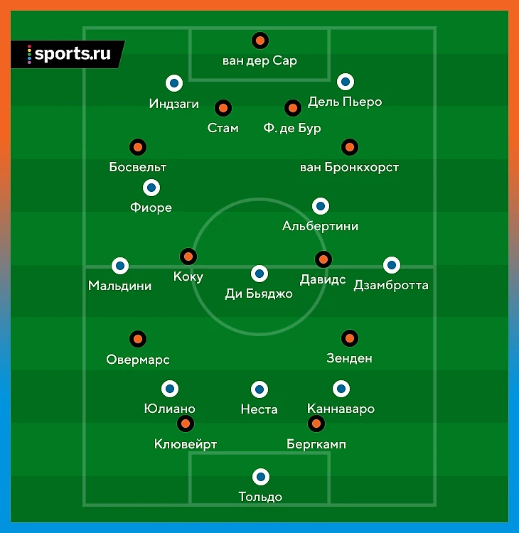 До перерыва Италия не нанесла ни одного удара, осталась в меньшинстве (к 35-й минуте Дзамбротта заработал две карточки, нарушая правила против Зендена), Бергкамп попал в штангу, а Тольдо потащил пенальти от Де Бура (Неста придержал за майку Клюйверта). «Мы были в полном порядке, – вспоминал Стам. – Абсолютно не переживали, что Италия может забить».
