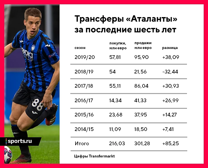 За последние шесть сезонов «Аталанта» только один раз ушла в минус по трансферам: много зарабатывают на воспитанниках и перепродажах