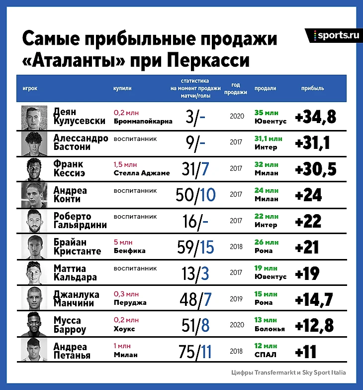 Маттиа Кальдара, Роберто Гальярдини, Андреа Конти и Алессандро Бастони принесли клубу почти 90 миллионов евро, причем Бастони сыграл за первую команду всего девять раз перед тем, как «Интер» сделал его самым дорогим футболистом в истории «Аталанты». Рекорд Алессандро перебил Деян Кулусевски – его и продали дороже, и сыграл он за бергамасков еще меньше. 35-миллионный новичок «Юве» провел в черно-синей форме 105 минут, а переезд в Турин обеспечил себе, играя в аренде за «Парму».