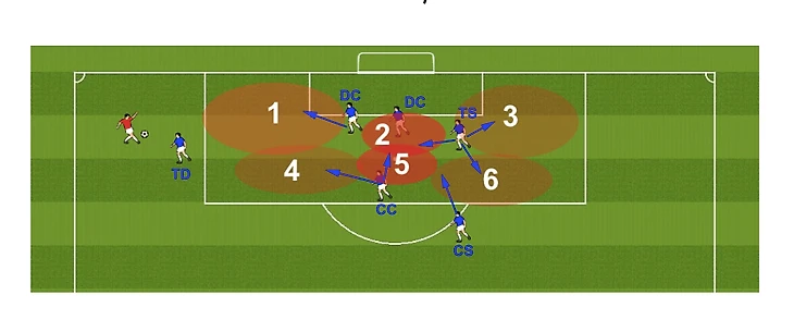 – когда мяч у соперника на фланге, команда защищается зонально. Игрок следит за соперниками в пределах своей зоны.