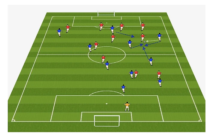 • создание и занятие свободных зон: свободные игроки ждут передачи за линией прессинга, а игроки под прессингом постоянно движутся, освобождая пространство;