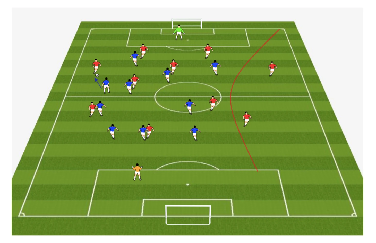 Подготовка обостряющей передачи. Основная задача команды в фазе атаки – найти игрока, который сможет сделать обостряющий пас. Два полузащитника постоянно находятся перед штрафной, между линиями обороны и полузащиты соперника. К ним также присоединяются другие игроки.