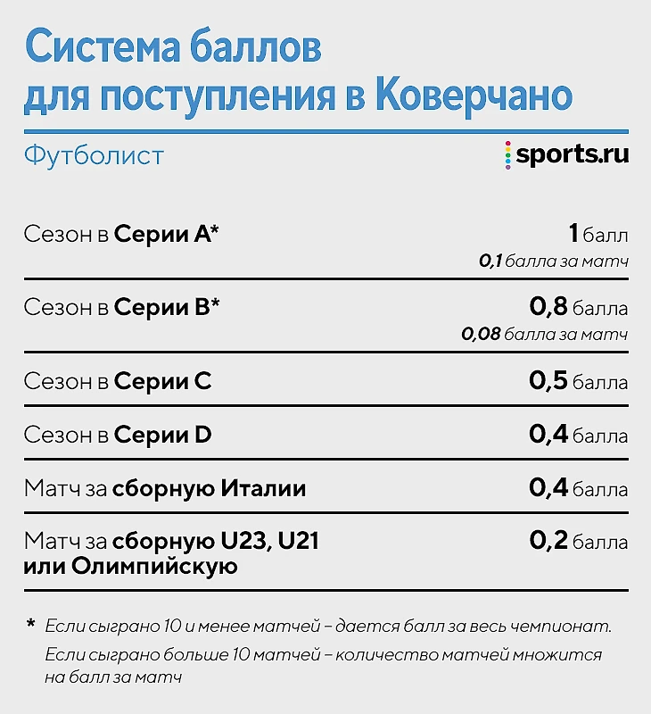 Очевидно, что профессиональные футболисты получают преимущество, но даже им бывает сложно попасть на курсы. Известный пример – бывший нападающий Кристиан Ригано, который большую часть карьеры провел в низших дивизионах, но поиграл в элите за «Фиорентину» (21 матч, 5 голов), «Мессину» (27/19), испанский «Леванте» (13/4) и «Сиену» (17/1).