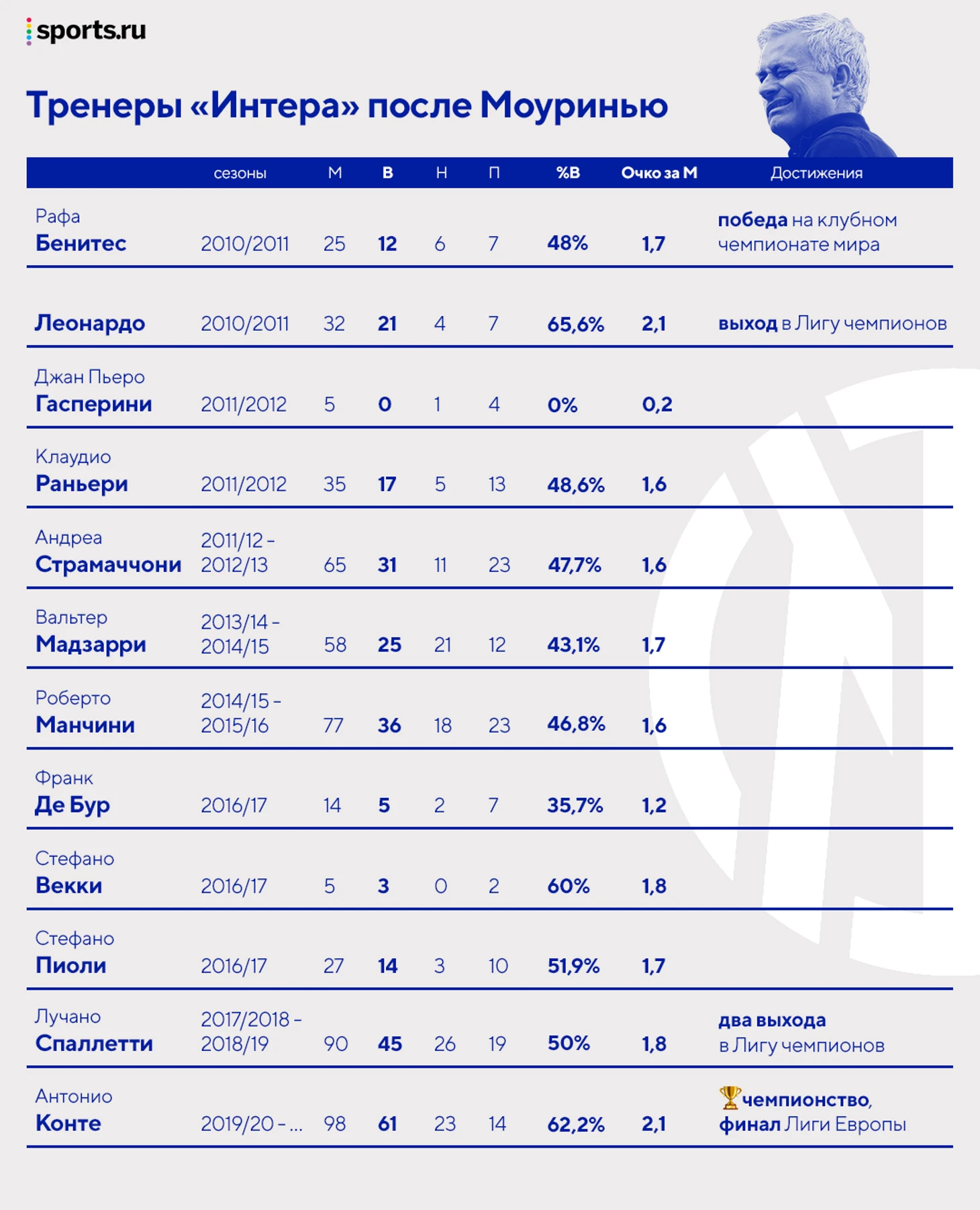 Де Бур продержался в «Интере» три месяца – победил «Ювентус», но проиграл семь из 14 матчей. Стефано Пиоли остался на полгода – начал с семи побед подряд, а уходил после семи туров без выигрышей. «Я провалился в «Интере»? Нельзя судить тренера по шести месяцам работы, – считает Пиоли. – Наш спад не был неожиданностью – мы слишком много сил вложили в серию побед, и это сказалось».