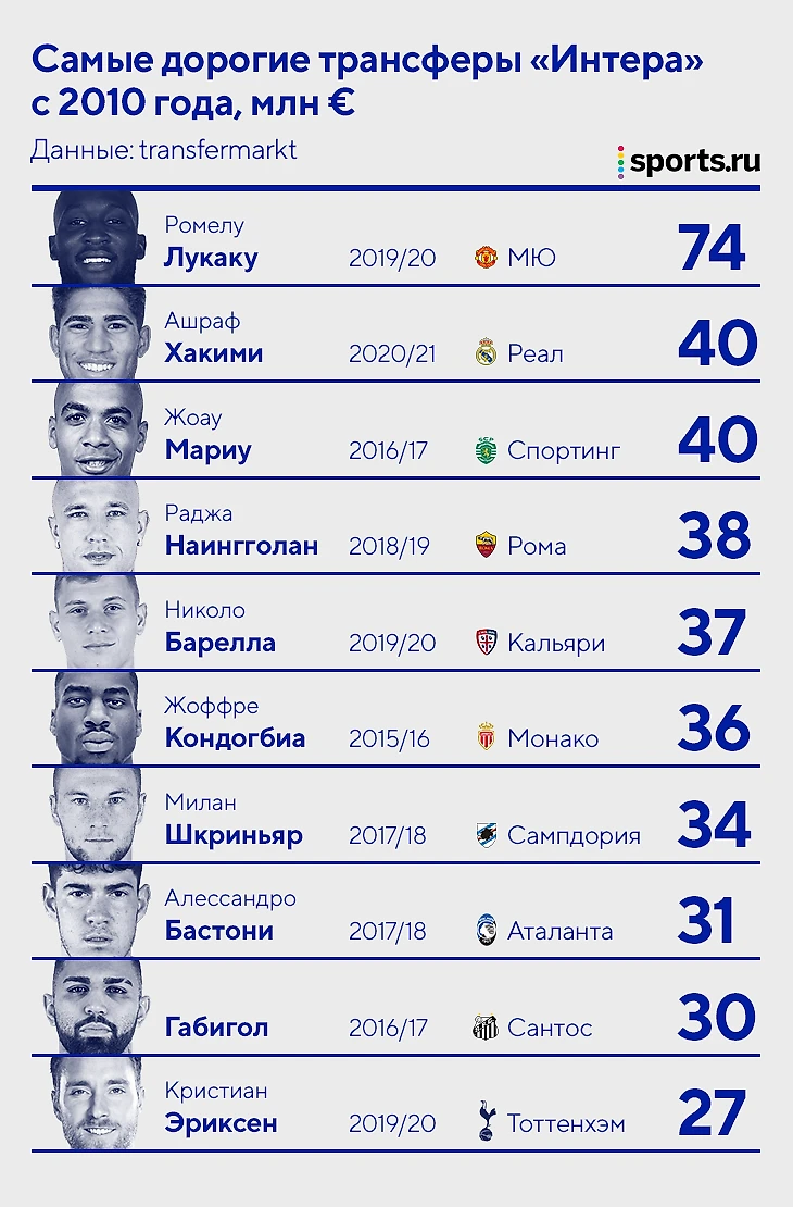 Девять из десяти самых дорогих трансферов за последние десять лет «Интер» оформил после прихода Suning. Четыре – после назначения Конте.