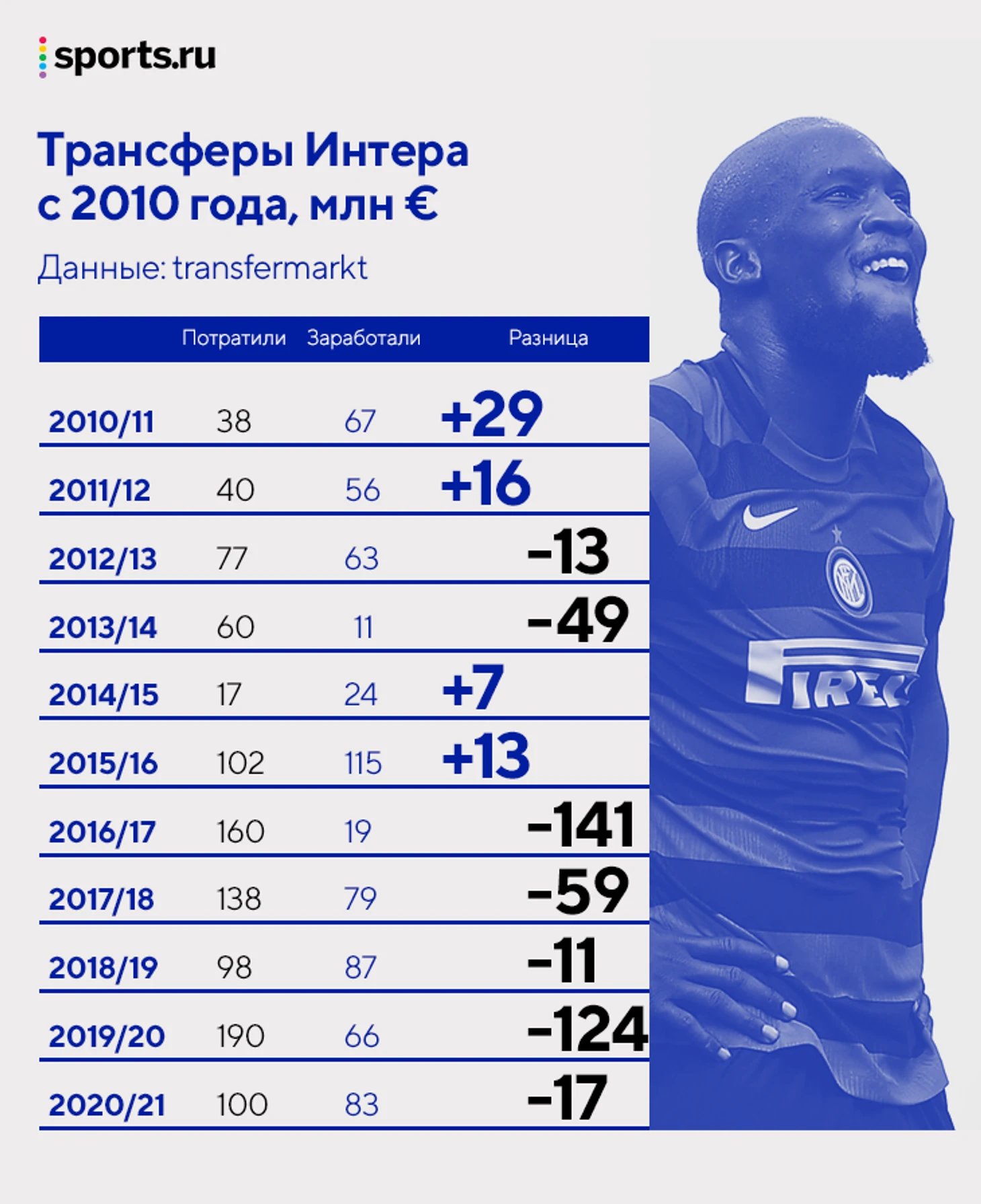 За 11 лет «Интер» потратил на новичков 1,2 млрд евро, 686 млн – после прихода Suning. При китайцах клуб ни разу не заработал на трансферах – «Интер» всегда тратит больше, чем выручает на продажах.