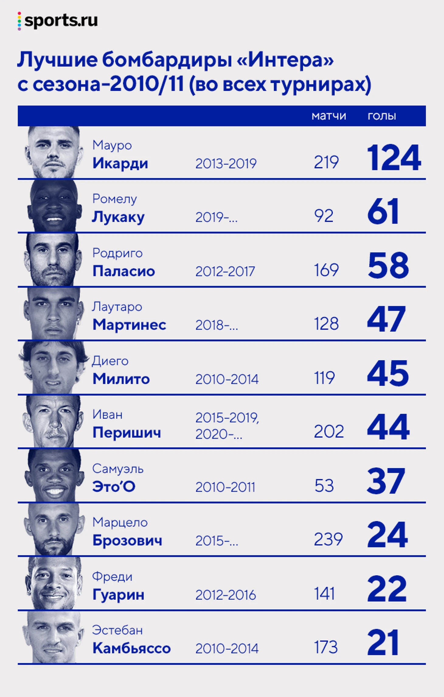 Ромелу Лукаку за два сезона вышел на второе место в списке бомбардиров «Интера» последних 11 лет. Мауро Икарди забил в два раза больше, чем бельгиец, но провел в «Интере» шесть сезонов.
