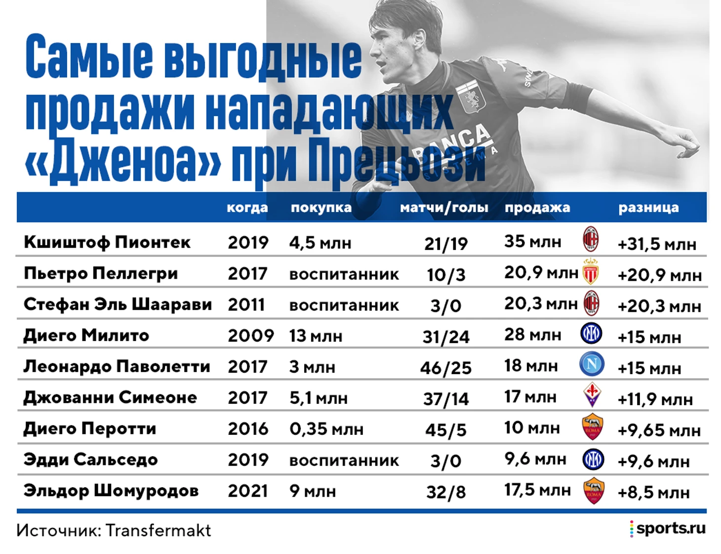 Прецьози купил «Дженоа» в 2003-м. За 18 лет генуэзцы действительно очень выгодно продали многих игроков атаки. Больше всего денег принес Кшиштоф Пионтек, чья стоимость за полгода выросла почти в 8 раз – его купили у «Краковии» за 4,5 миллиона, а в «Милан» отправили за 35 млн.