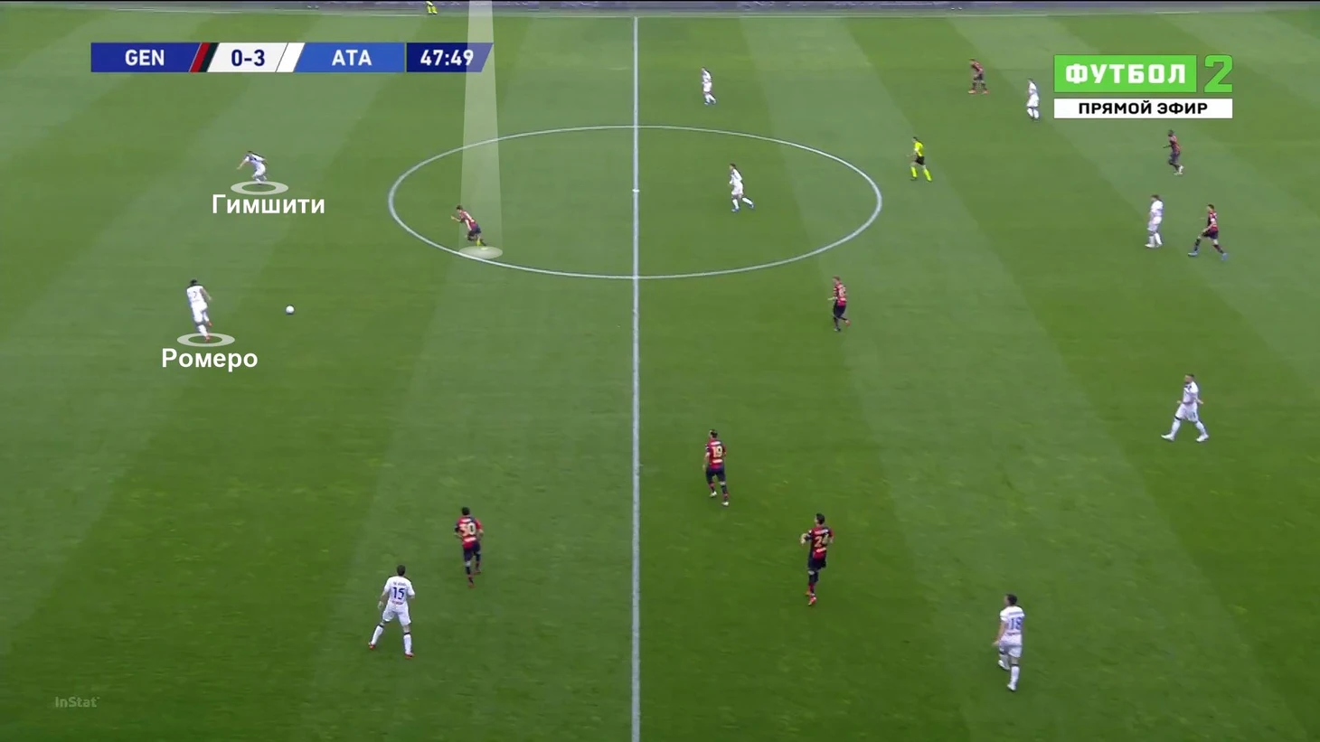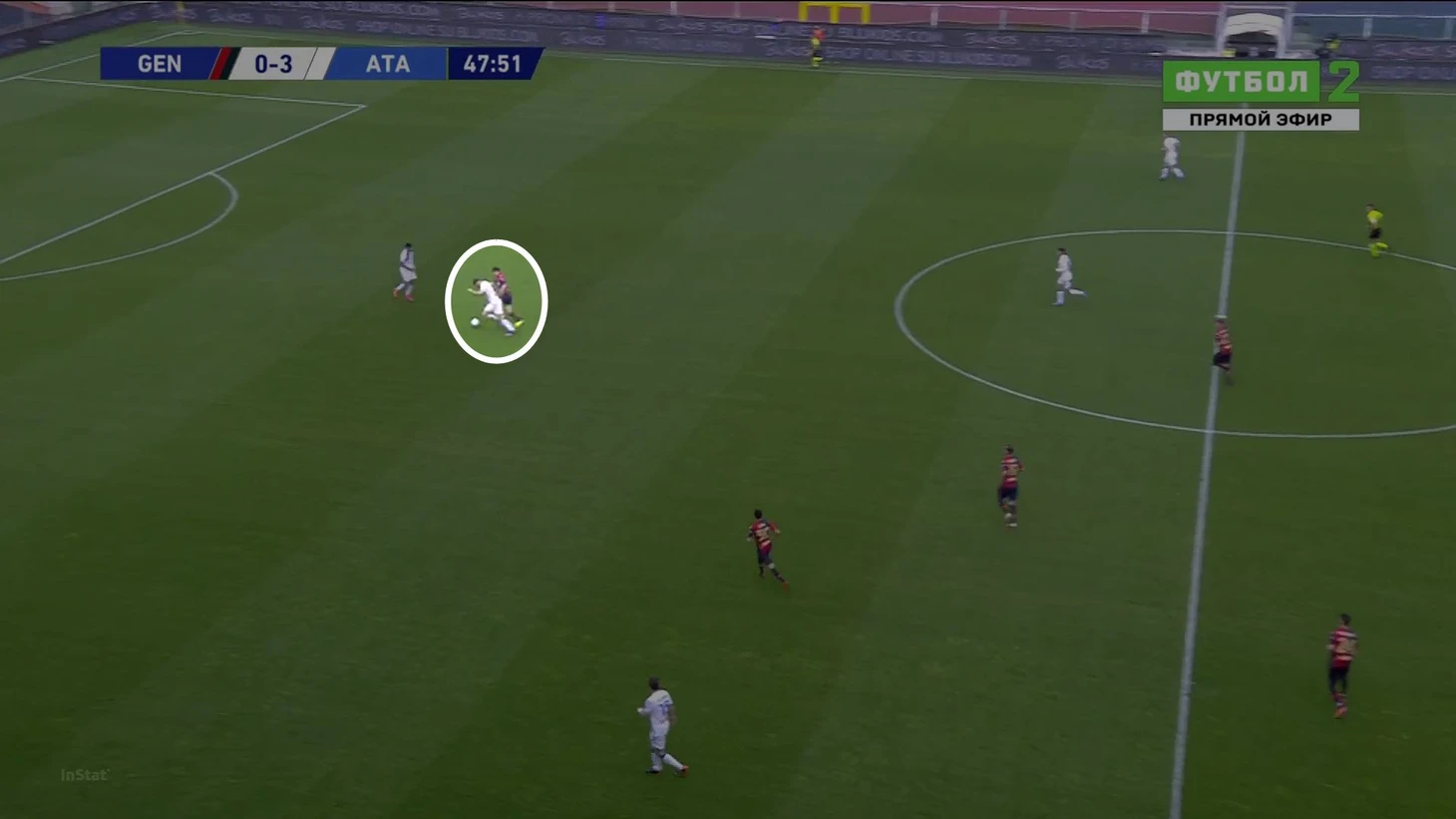 Особенно ярко получилось против «Аталанты». Шомуродов реагирует на небрежный пас Руслана Малиновского назад, хотя сзади два защитника «Аталанты» и оба ближе к мячу: