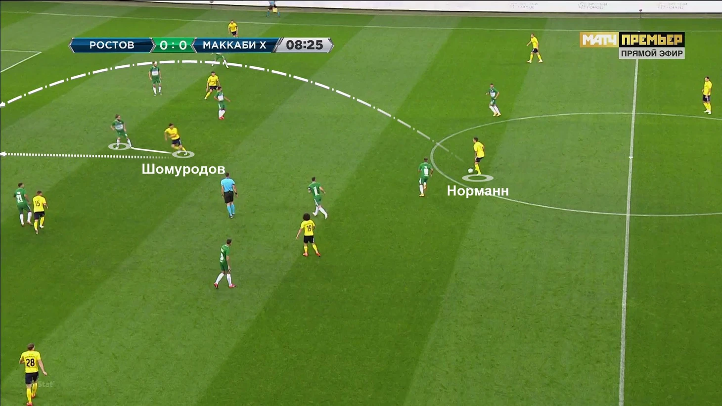 Шомуродов заранее начинает рывок. Норманн только получил мяч, а Эльдор уже движется (в отличие от его оппонента) – это поможет опередить защитника в не самом очевидном эпизоде: