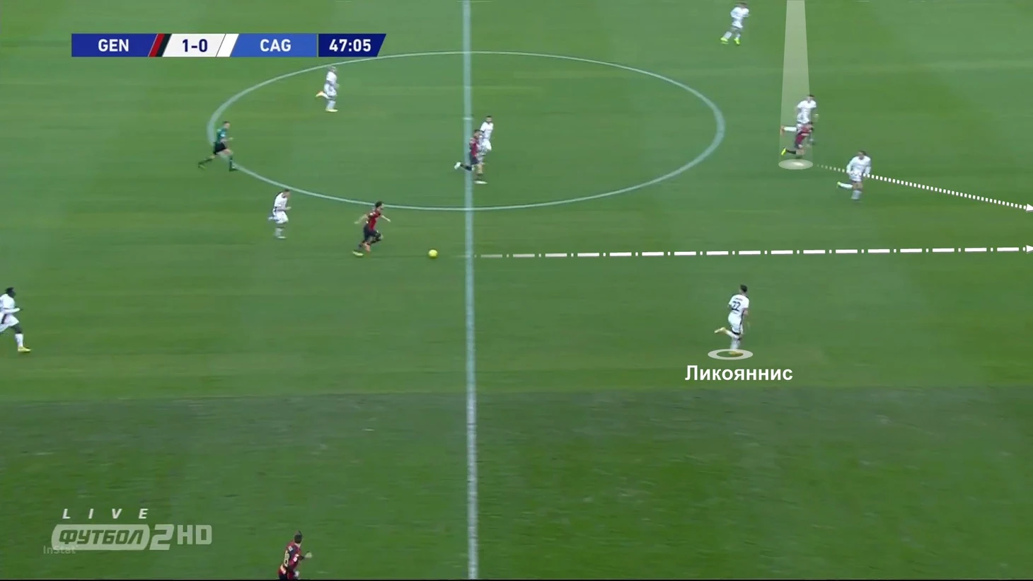 Тоже контратака – в этот раз Шомуродов открывается на другом фланге (заметил, что есть простор для открывания – левый защитник «Кальяри» Хараламбос Ликояннис не успевает вернуться):