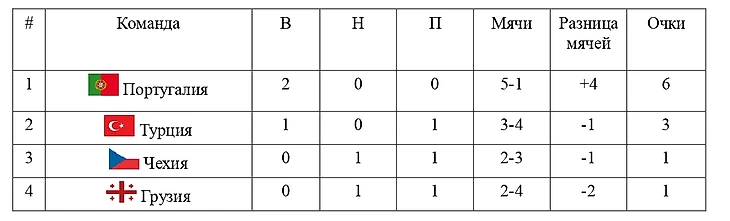 Португалия с Роналду уже вчера обеспечили себе первое место в группе и лишили себя головной боли в последнем туре. Турции же для попадания в плей-офф со второго места необходимо не уступить Чехии в их очном матче. В обратном случае останется надеяться на то, что Португалия не решит вдруг играть в поддавки с грузинами и не проиграет, иначе турки окажутся на третьем месте с 3 очками и отрицательной разницей мячей, что может привести и к вылету.