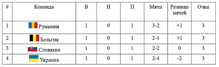 Вот и выявилась истинная группа «смерти», где перед третьим туром у всех команд есть шансы на выход. Для начала стоит объяснить, почему у команд при равенстве очков такое расположение в таблице. При равенстве очков смотрят на результаты личных встреч между командами, но т. к. все команды в группе кого-то выиграли и кому-то уступили, то данный показатель отбрасываем и не учитываем. Дальше идет разница мячей — тут Румыния и Бельгия выходят вперед, Словакия третья, а Украина последняя. Первое же место определяем по следующему показателю — количество забитых мячей. Тут впереди Румыния, следовательно, она и занимает первое место. Если же команды сыграют обе игры в ничью, то расклад не поменяется.