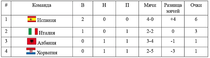 Но в этот сценарий может внезапно вмешаться скромная, но боевитая Албания, обыграв Испанию. Да, такое маловероятно, но если это случится, то при равенстве очков обладатель второго места будет определяться между Албанией и Хорватией исходя из их разницы мячей. А тут расчёты не в пользу шашечных, т. к. из-за поражения 3:0 от Испании, они уступают в этом показателе албанцам на 2 мяча. Следовательно для выхода сразу, а не ожидать конца тура, надо разгромно обыгрывать Италию. Но, кто бы не занял третье место в данной группе, выйти в 1/8 Евро вполне можно будет и с 4 очками с третьего места. Вот кто точно будет в проигрыше при таком раскладе, так это сборная Италия, которая вместо защиты титула, начнет паковать чемоданы домой.