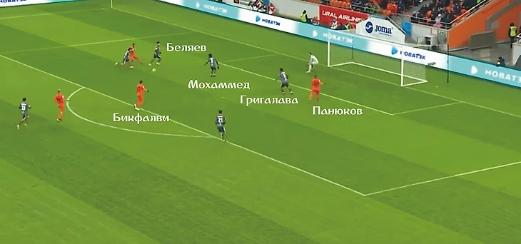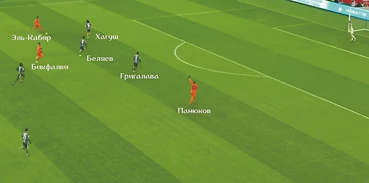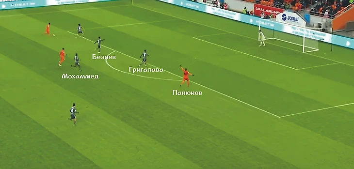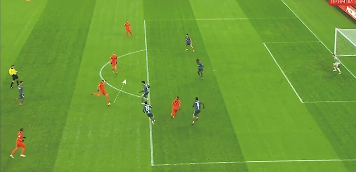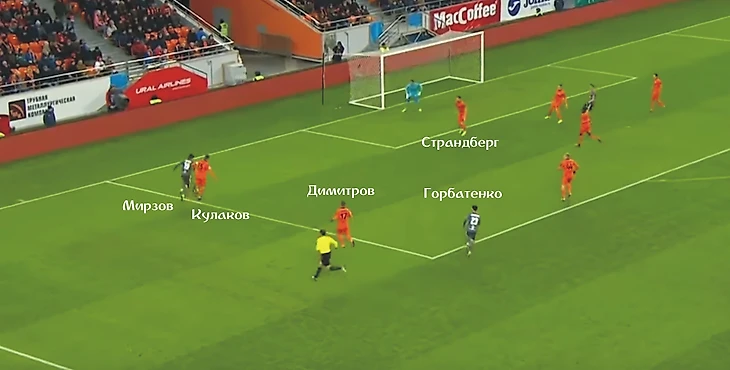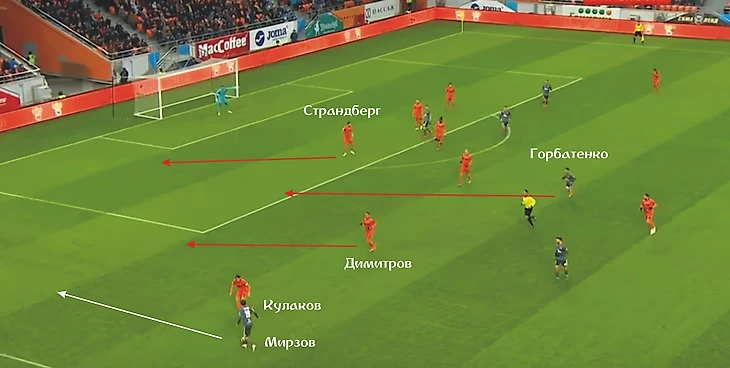 Видим, что игрок "Арсенала" готовится стартовать по флангу, нисколько не боясь Кулакова. В этой ситуации обращают на себя внимание действия других игроков. Димитров и Страндберг должны были страховать партнёра, если Мирзов его обыграет, а вот Горбатенко, отвечающий за левую центральную зону, должен бы ворваться в свободное пространство штрафной.