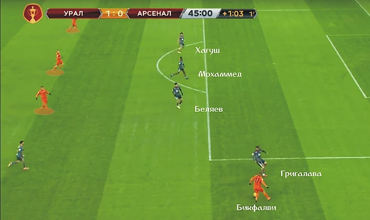 Бикфалви легко уходит от Григалавы, а перед ним три свободных партнёра, у "Арсенала" же три защитника держат линию. Что ж, линию удержать они смогли, как видим, безупречно.