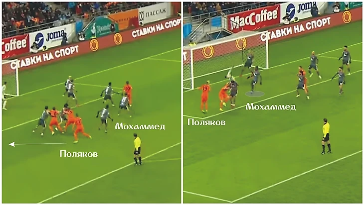 Надо полагать, угловой был наигранным. Поляков из центра штрафной побежал к дальней штанге, куда шёл навес. Его держал Мохаммед, но как только Поляков побежал, Мохаммед не стал следовать за ним. Видимо, когда его просят выполнять черновую работу, он зовёт адвокатов, звонит Яя Туре и готовит официальное заявление о засилии расизма в России.