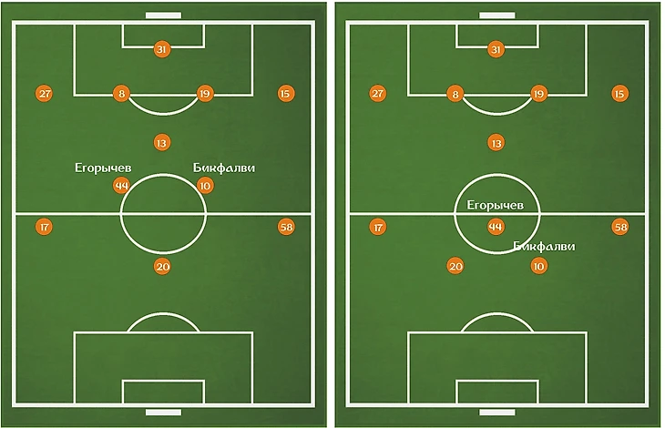 После первого гола "Урал" перешёл на игру в два нападающих, после второго гола вышел Погребняк, а Егорычев отошёл на место Бумаля.