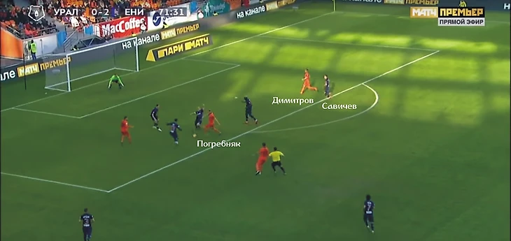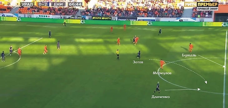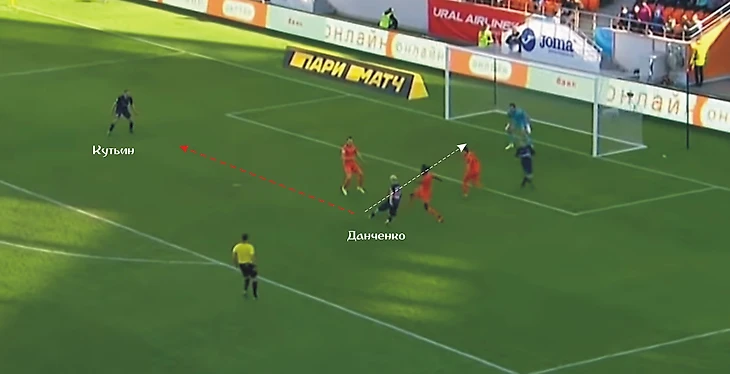 Зотов хорошо видит поле и моментально отдаёт мяч на Данченко, перед которым полная свобода. Меркулов оказался не у дел, спасать ситуацию бросается Бумаль. Казалось бы, стремительный Данченко должен выйти один-на-один, однако Бумаль демонстрирует удивительную скорость. Удивительную тем, что обычно он её не включает. Данченко уходит в последний момент от Бумаля и оказывается в следующей ситуации.