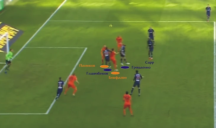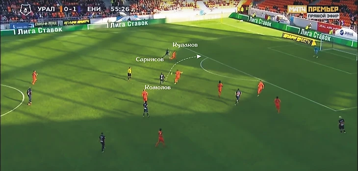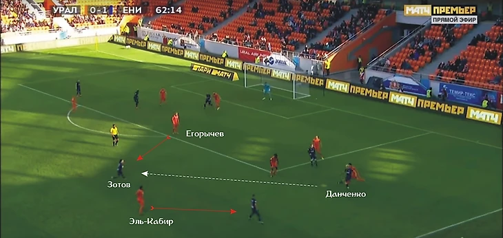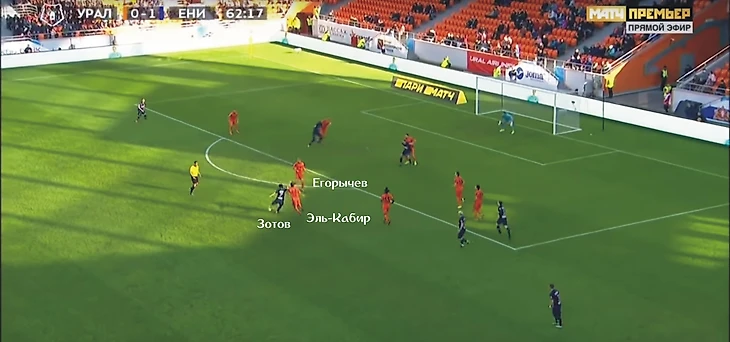 Данченко отдаёт мяч на Зотова. Опорную зону стережёт Егорычев, Эль-Кабиру следует опекать игрока фланга.