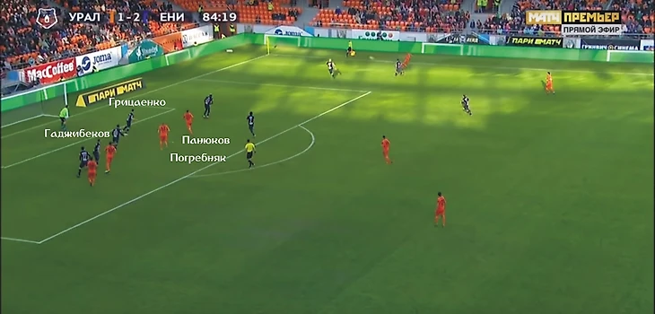 Через четыре минуты "Енисей" должен был забивать третий мяч. "Урал" увлёкся атакой, а Данченко подкараулил свободную зону.