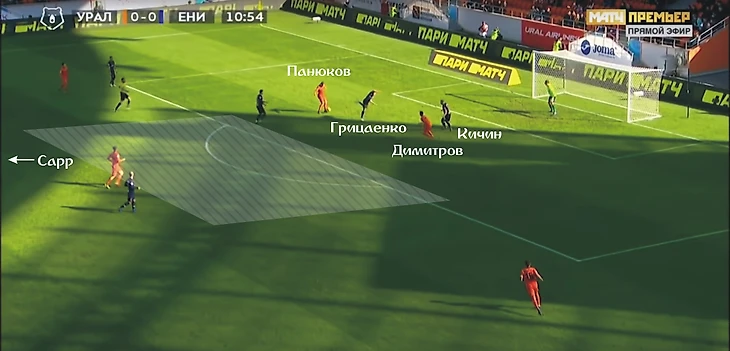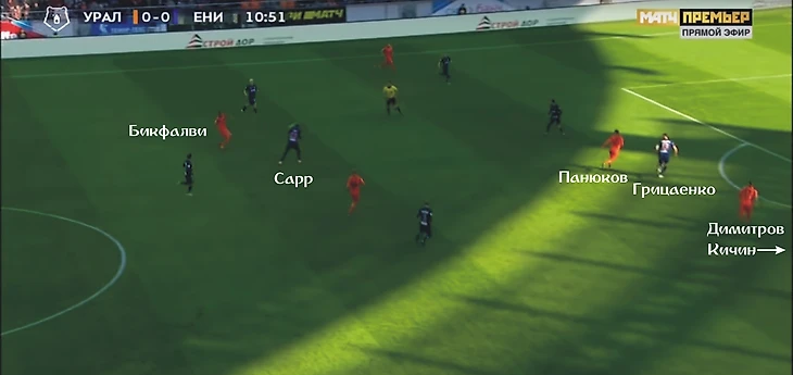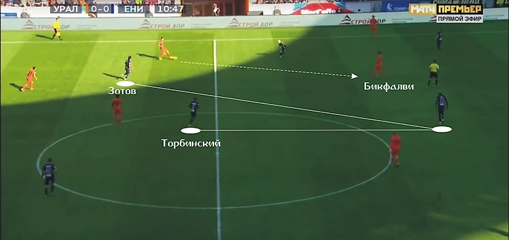 Первый момент был у "Урала". Видим, как Бикфалви спокойно принимает мяч. В этом эпизоде Зотов зачем-то стал прессинговать защитника, и так оказалось, что на пару с Торбинским он оказался вообще не при чём. Как и Сарр, который, кажется, вышел играть в футбол через "не могу, не хочу, ну да ладно".