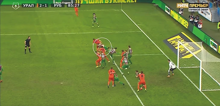 Абсолютно такая же контратака. Снова Байрамян скидывает мяч отошедшему Полозу, которого снова никто не контролирует. У "Урала" в опорной зоне уже играет Емельянов вместо Бумаля, что, к слову, большая радость для "Урала", поскольку Емельянов смотрится в опорной зоне много лучше. На сей раз Полоз ударил куда лучше, и мяч Годзюр не зафиксировал. Как раз первым на добивание пришёл Байрамян, которому немного не хватило до гола. Видим, что Башкиров на этот раз оказался уже у самых ворот ближе защитников "Урала".