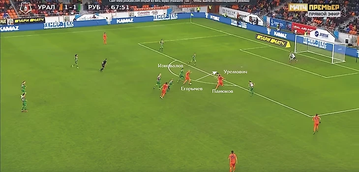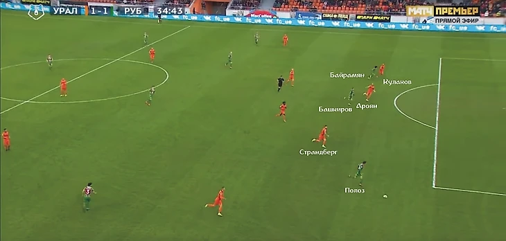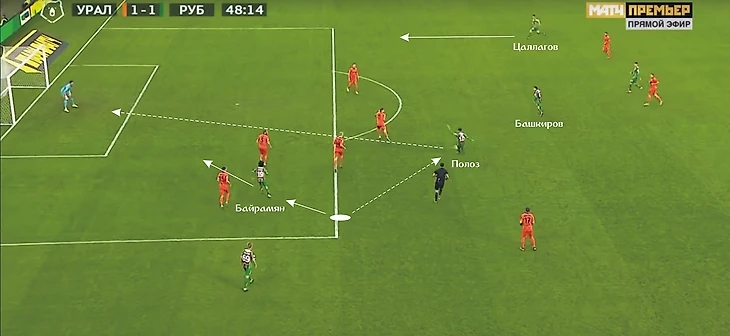 Смотрим момент на 49-й минуте. Байрамян двигается на левом фланге с мячом, Полоз отходит в опорную зону, где у "Урала" шаром покати. Впрочем, это от того, что Бумаль в это время лежит травмированный на чужой половине поля. Башкиров, как увидим позже, желает ворваться в штрафную, но не успевает. С правого фланга готов поддержать атаку Цаллагов.