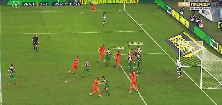 К этому моменту из трёх утомившихся полузащитников основы заменены двое - Подберёзкин и Башкиров. Третий, Коновалов, отстоять честь основы не сподобился. При подаче углового он так держал Бикфалви, что тот мог перемещаться по штрафной хоть на слоне.