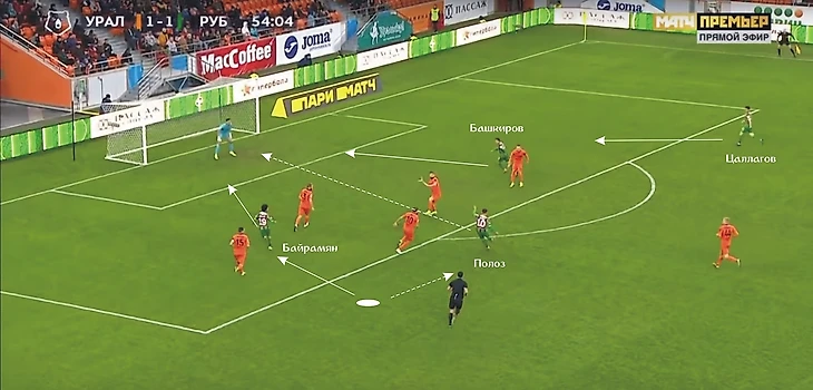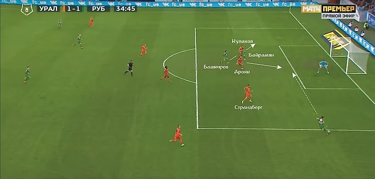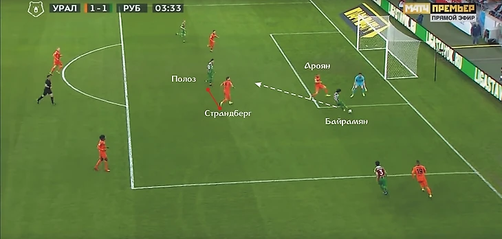 Башкиров и Байрамян перекрещивают траектории движения, из-за чего Башкиров остаётся один слева. Пас идёт на выскакивающего на ворота Байрамяна.
