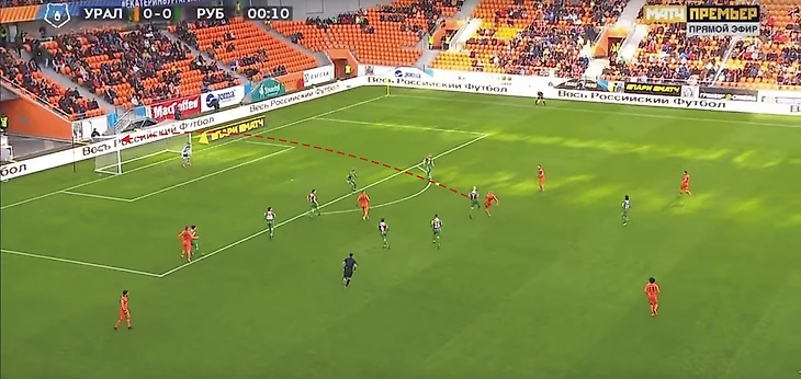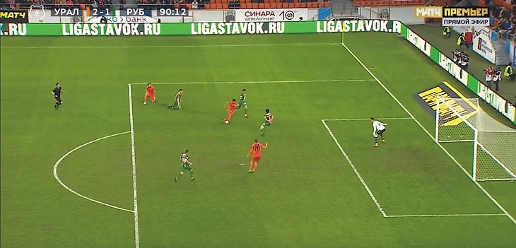 К сожалению для "Рубина", Байрамян на попал по воротам, за что и не стоит его винить - так попасть ещё надо уметь, зато он верно выбрал позицию и правильно сместился под передачу.