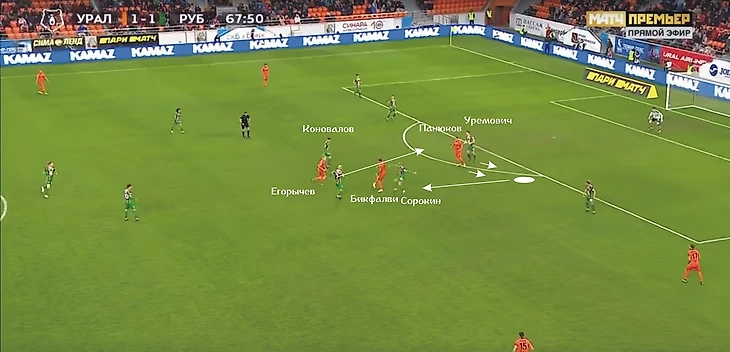Бикфалви получает мяч перед штрафной в одиночестве. Очень правильно действует Сорокин, сразу вылетевший из линии на нападающего. Из центральной зоны врывается Егорычев, его вяло преследует явно уставший Подберёзкин, и словно шаркающий дедушка, волочится Коновалов. Бикфалви отдаёт тонкую и точную передачу, Егорычев проникает в штрафную между защитниками, одного из которых грамотно уводит в сторону Панюков.