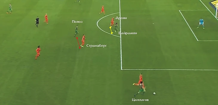 Атака началась с правого фланга "Рубина", где большую активность проявлял Цаллагов. Казанцев в атаке было всего трое: кроме Цаллагова это пара нападающих Байрамян и Полоз. Однако, чтобы забить мяч, оказалось достаточным и грамотных действий и небольшой ошибки защиты, а именно Страндберга. Видим, как Ароян контролирует Байрамяна, а вот Страндберг забыл про Полоза, оставив того в одиночестве.