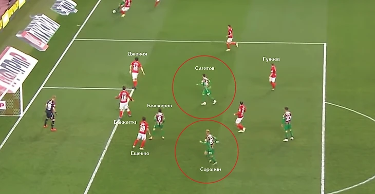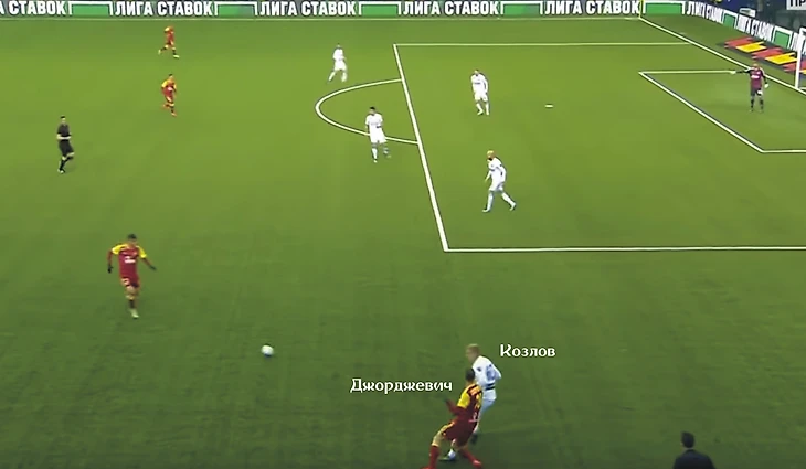 Комбинация туляков начинается следующим образом. Джорджевич на фланге с мячом, с черногорцем играет защитник Козлов. Следует пас на Бакаева.