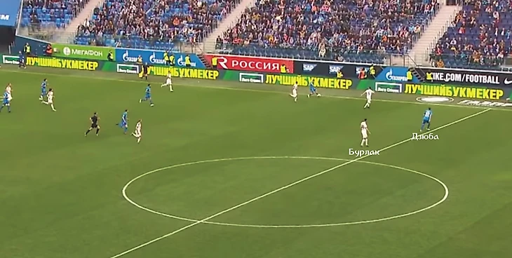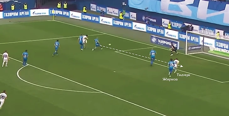 Линией обозначена группа из пяти защитников, которые так ловко сметились вправо, что Ерёменко предоставили самому себе. Сразу вспоминаем про полузащиту, состояющую из Закирова, Кулика и Ондуа. Вспоминаем мы, а сами они вспомнить свои обязанности могут не всегда. Левый центральный полузащитник Закиров не видит, что в его зоне находится Ерёменко, как впрочем и Ондуа не видит, что находится на таком участке поля, где с таким же успехом можно поставить чучело.