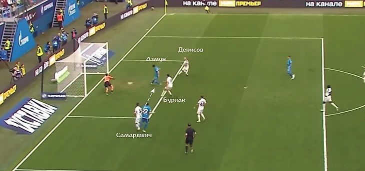 Вот оно что! Снова Бурлак и Денисов благополучно делегировали друг другу полномочия по обороне против Азмуна, снова Самарджич пропустил передачу во вратарскую. Ошибка защитников в том, что они играют строго позиционно, а грамотный Азмун своим правильным расположением между ними показал слабость такой манеры игры. Расположиться между игроками, которые бессмысленно хранят верность схеме, верный способ заиметь опасный момент.