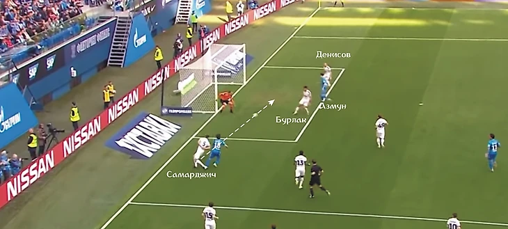 Град голов самарцам начал Азмун. Иранец грамотно расположился между Бурлаком и Денисовым, то есть между центральным и крайним защитниками. Пас Жиркова и гол. Вина на защитниках, которые искренне полагались друг на друга. Как увидим, настолько грамотно Азмун расположился неспроста, позицию выбирает он с умом, а не просто так.