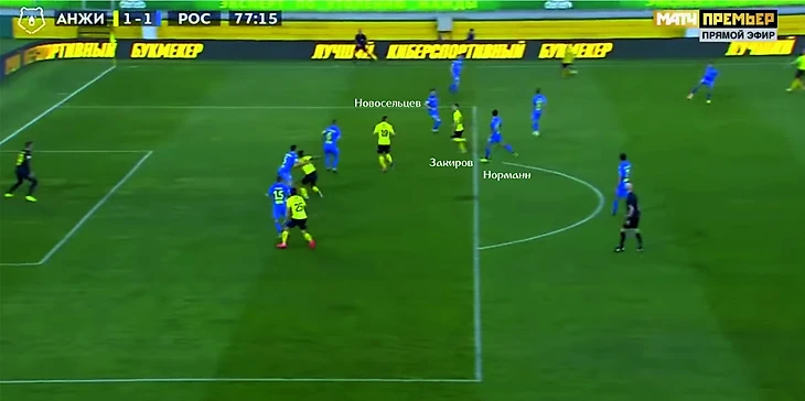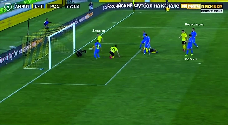 Эльмурзаев без особого сопротивления со стороны Глебова направляет мяч в ворота, вратарь отбивает удар, но мяч добивает Закиров. Видим, что Норманн неприятно удивлён - и это всё, что в его силах. Вину делят Глебов и Норманн.