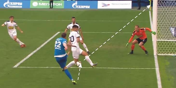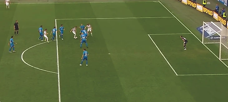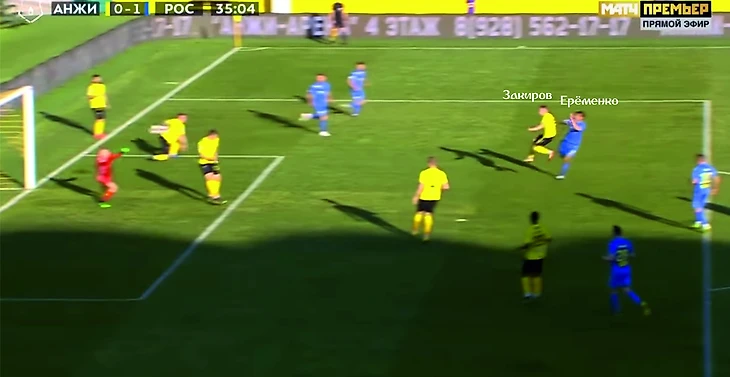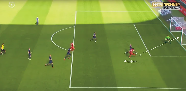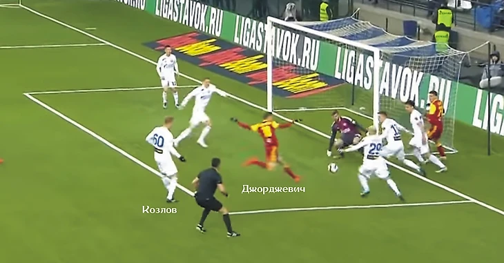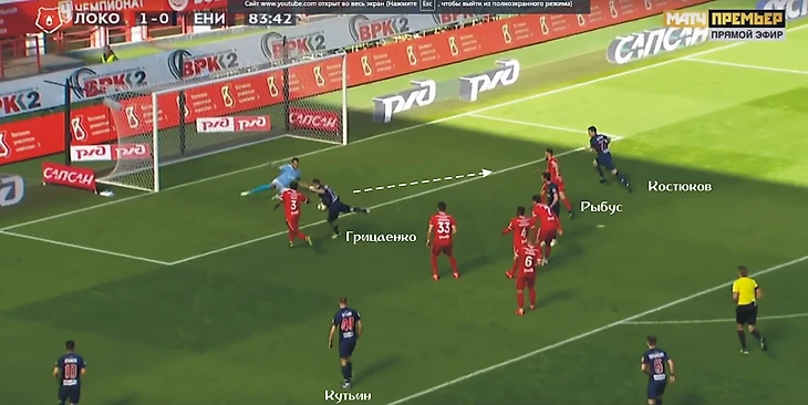 И Грицаенко проходит без проблем, и Костюков первым оказывается на добивании. Вину делят Фернандеш (который в момент гола всё же дошёл до штрафной) и Рыбус.