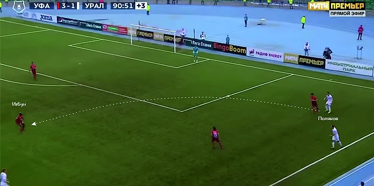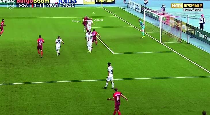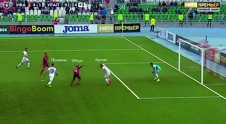 Четвёртый гол - новый подарок "Урала". Поляков, вынося мяч, адресует его прямо в ноги Игбуну. И вот ни метром вправо, ни метром влево. Игбун без помех со стороны ближайшего игрока проходит к воротам и забивает гол. Кто был этот ближайший игрок, последняя возможность спасти ситуацию? Правильно, снова Ароян. Ещё заметьте, что Игбун вообще один, а центральный полузащитники пропали напрочь. Ушли погулять, игра же недостаточный повод выходить на поле.