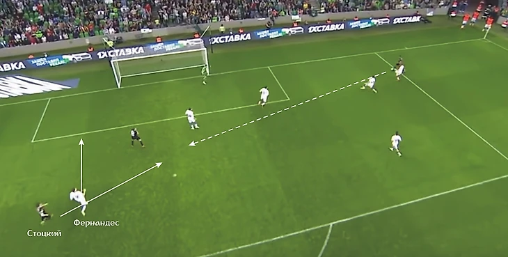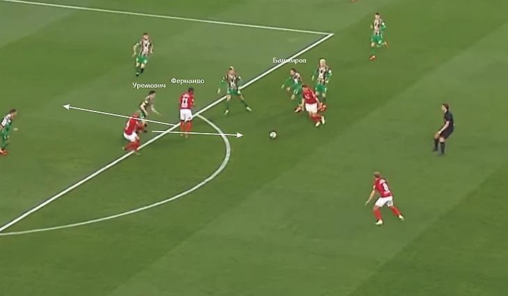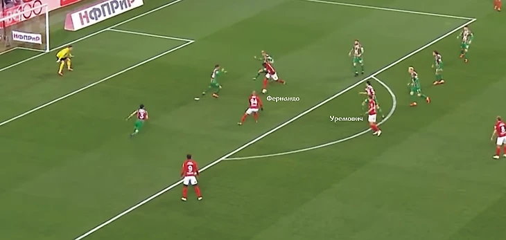 Фернандо врывается в свободную зону, правильно оставленную Сорокиным, но Башкиров и бразильца бросил, и Сорокину движение перекрыл, и Зобнину не помешал. Вот помощник, о котором мечтает любой соперник! Уремович, видя одинокого Фернандо, идёт на него, но передачу пресечь у него не получается.