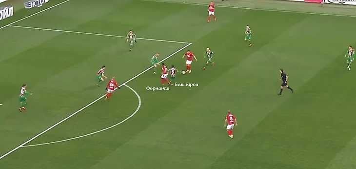 Первыми гол забили красно-белые. Башкиров шёл-шёл за Фернандо, но решил перед штрафной переключиться на Зобнина, несмотря на то, что Сорокин его прекрасно закрывал.
