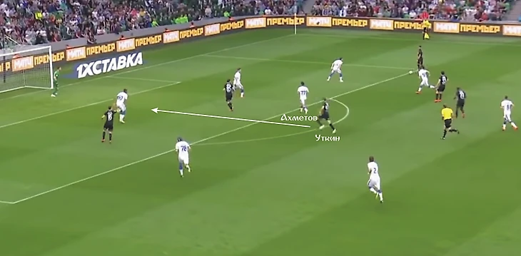 Вандерсон на фланге, следует передача на Игнатьева, которого никто не держит, хотя Васин должен это сделать, ибо иного варианта у него нет. Уткин же врывается в штрафную при попустительстве Ахметова. Мяч в итоге попадает к Игнатьеву, а от того Уткину, который и забивает гол. Вина на тех, кто нападающих упустил - Васине и Ахметове.