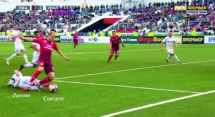 Следующий гол тоже занимателен. Ароян на крупном плане перед камерой медленно подкатывается под Сысуева и аккуратно подцепляет его ногу. Пенальти, гол и номинация на "Золотого орла".