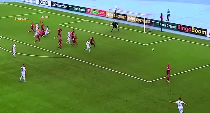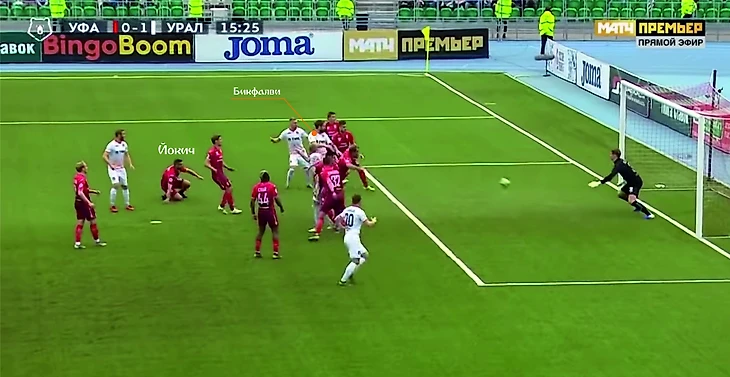 Голевая комедия начинается с гола гостей. Йокич опекает Бикфалви при подаче со штрафного, но через пару шагов спотыкается и падает.