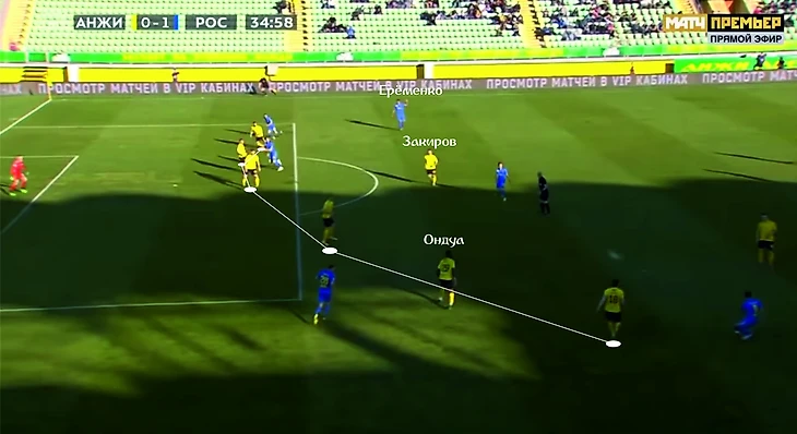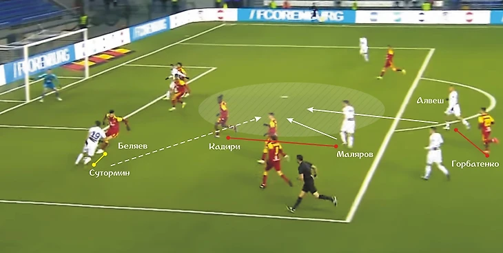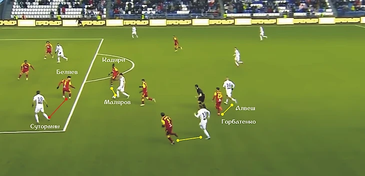 Беляев напрочь бросил Сутормина, Кадири одно что рядом с Маляровым, а на деле никак ему не мешает, Горбатенко робко следует за Рикарду Алвешем. Маляров отдаёт мяч Сутормину и пожалуйте.