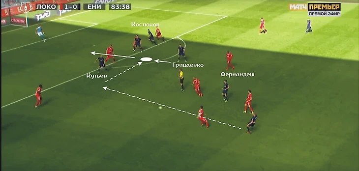 "Енисей" сравнял счёт красивой комбинацией. Пас из центра поля вразрез от Кичина на Кутьина. Снова заметим, что провинившийся футболист частично себя реабилитировал. Кутьин отдаёт мяч Грицаенко, который, очевидно, тоже жаждал за что-то оправдаться. Грицаенко прошёл в свободное пространство и ударил по воротам. Возле Грицаенко всё время, пока тот ждал мяч, стоял Фернандеш, но не верил в необходимость защищаться.
