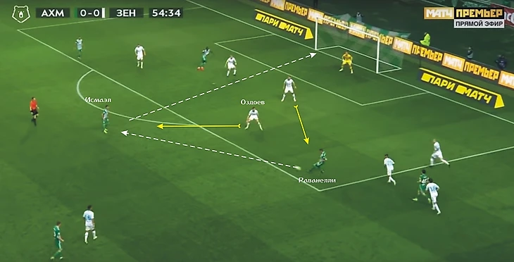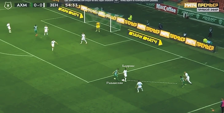 Далее следует пас Исмаэлу, который отдыхает прямо перед штрафной. Его должен накрывать Оздоев, но тот встал непонятно куда, не давая защитнику свободно выходить на Раванелли, если бы тот двинулся в штрафную. Раванелли откидывает Исмаэлу, и тот забивает точным ударом. Оздоев, получается, и Исмаэла не накрыл, и смутил своего защитника, который должен был страховать Барриоса. Вину делят Барриос и Оздоев.
