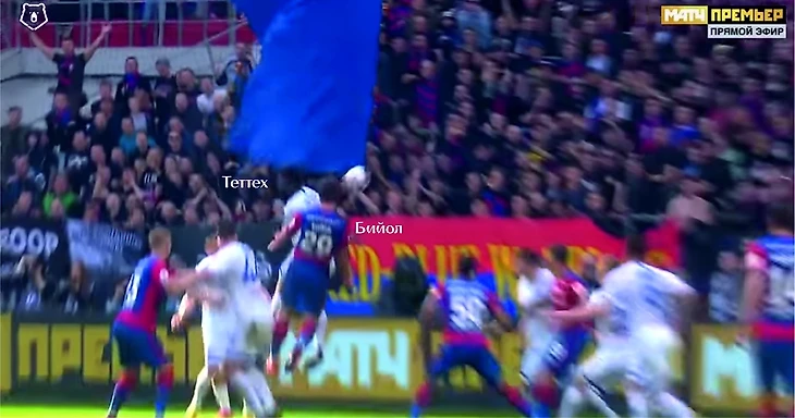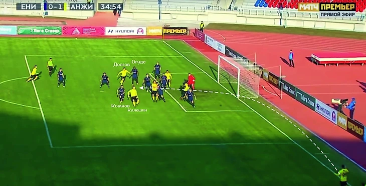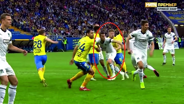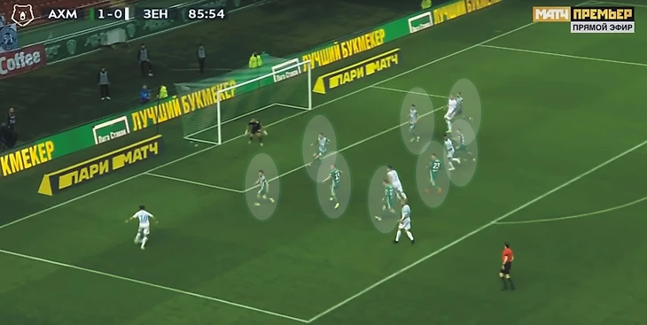 Чтобы сберечь счёт, грозненцы всей командой решили встать в штрафную и ложиться насмерть. В голевой ситуации видим, мяч у Жиркова, а в штрафной восемь игроков "Ахмата".