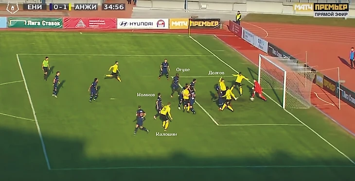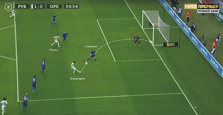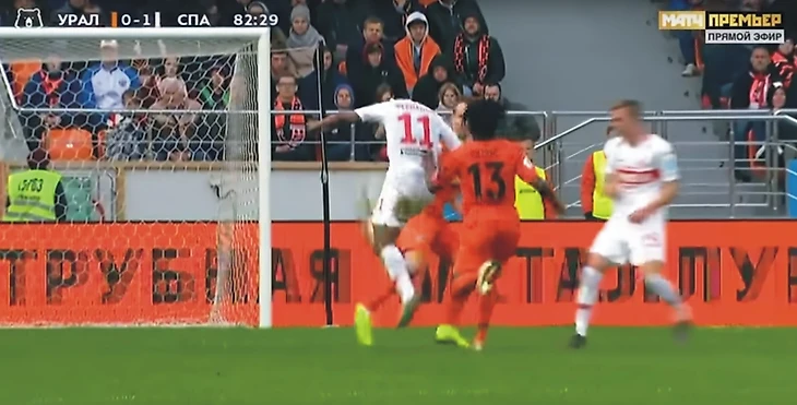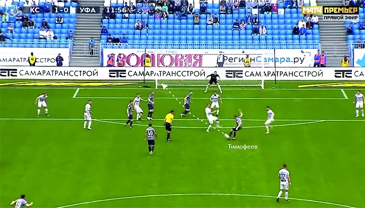 Первый гол забивает дальним ударом Тимофеев. Полузащитник пытается его накрыть, но удар получился сильным и точным. На редкость в туре таких много. Да, опорник чуток не успел, но всё же по моему мнению это не причина, чтобы его винить.